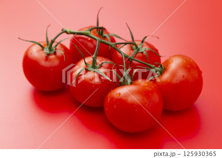 赤背景に房摘みトマト