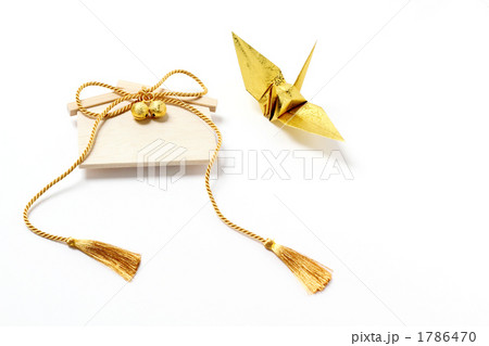 金色の房紐と鈴のある絵馬 金の鶴 左