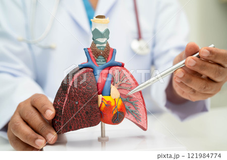 Pneumonia, lung cancer, Asian doctor holding human anatomy model for study diagnosis and treatment in hospital.