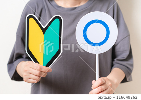 初心者マークとまるのプレートを持つ女性
