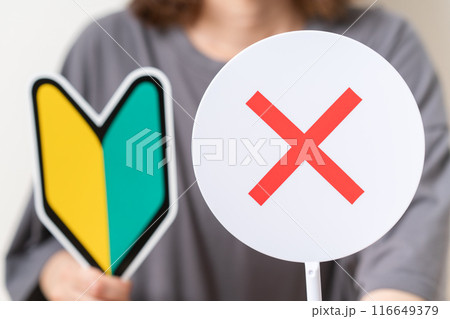 初心者マークと×のプレートを持つ女性