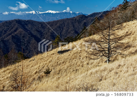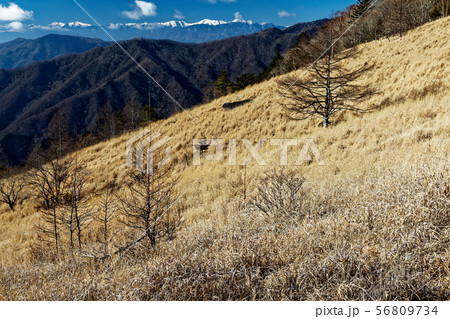 冬の扇平の草原を行くハイカーと乾徳山山頂