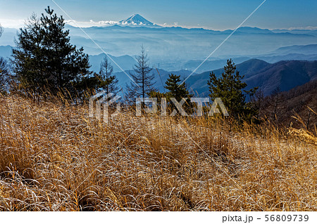 乾徳山の扇平から望む富士山と甲府盆地 山梨県 山梨市