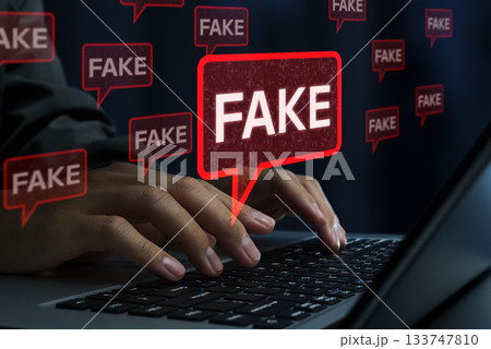 ソーシャルメディア上のフェイクニュースと誤情報。クリックベイトコンテンツと悪意ある偽情報。ノートパソ