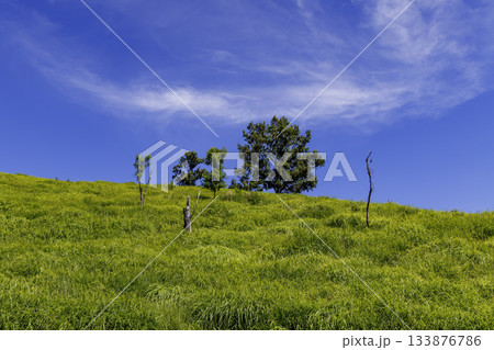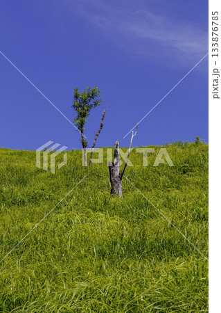 扇棚田に立つ三本の杉(熊本県阿蘇郡産山村)