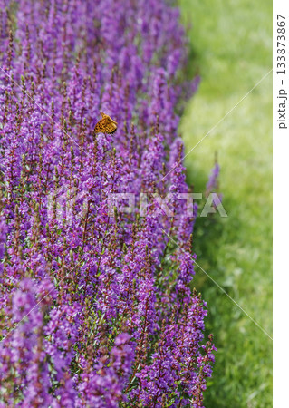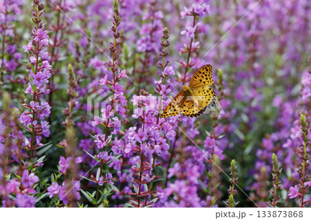 ミソハギとツマグロヒョウモン(熊本県阿蘇郡ヒゴタイ公園)
