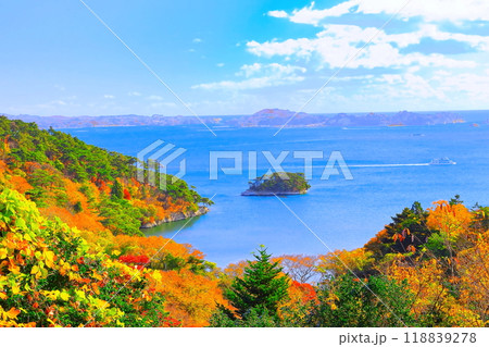 爽やかな青空と鮮やかな紅葉の松島四大観扇谷