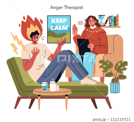 Anger management therapy session with a calm professional and a distressed client. Overcoming emotions through guidance. Vector illustration.