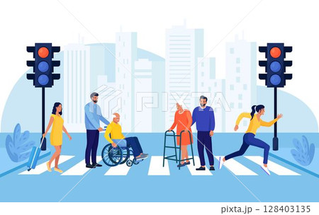 Men helping old people with disability crossing city street. Woman walking on road crosswalk and hurry to work. Urban lifestyle and traffic concept. Pedestrians moving by road with traffic lights