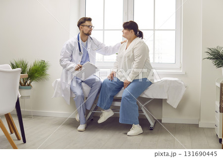 Doctor talking about treatment to woman patient, supporting and calming her down