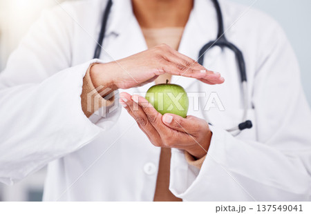 Hands, apple and doctor, health and diet with nutritionist person, healthy food closeup and lose weight. Dietician, healthcare and wellness, green fruit and clean eating with vegan, organic and fiber