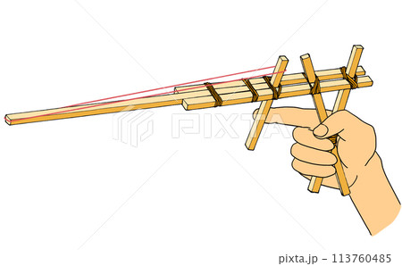 手作りおもちゃ割りばし鉄砲で輪ゴムを発射しようと構える手のイラスト