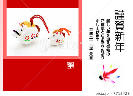 馬の親子 写真年賀状 午年人形と紅白枠|謹賀新年