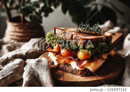 Enjoy a delicious breakfast sandwich made with crispy bacon, fresh tomatoes, leafy greens, and cheese, served on toasted whole grain bread. Perfect start to the day