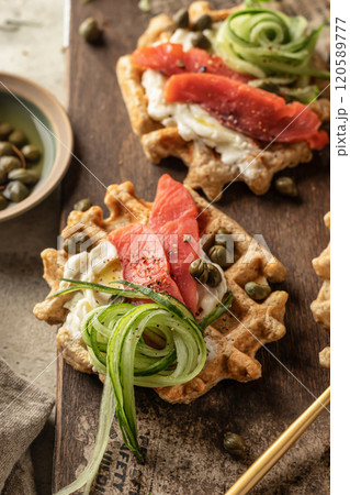 Savory waffles close up. Breakfast waffles with cream cheese, cucumber, salmon on wooden board for breakfast on rustic textured background