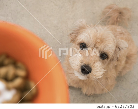 ドッグボウルに入ったペットフードをじっと座って見つめるかわいい小型犬【マルプー】