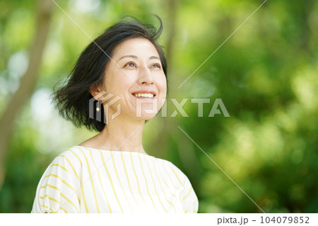緑の中で風に髪をなびかせる爽やかな中年女性