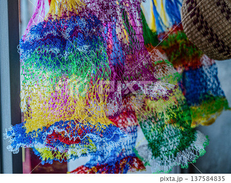 Ethnic souvenirs, baseball caps, bags with various pattern hanging in street market