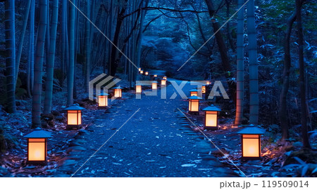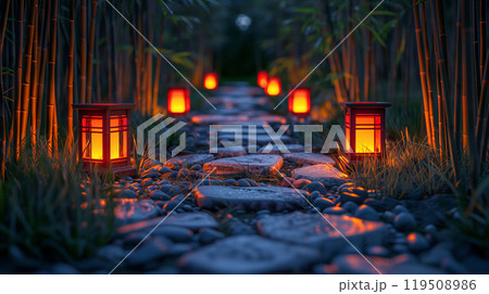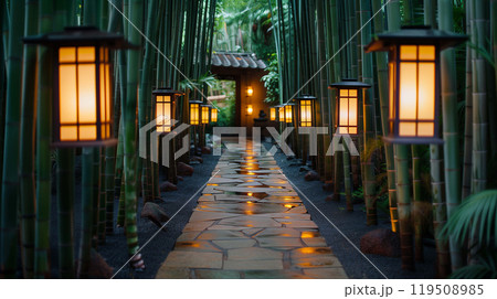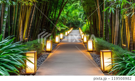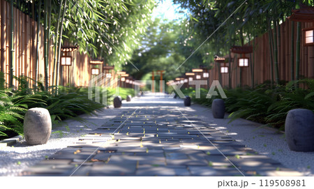 Peaceful stone path stretches out, flanked by dense bamboo groves that sway gently in the breeze