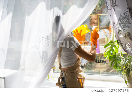 Woman in rubber gloves and apron manually washes window of house with rag cleaner and mop inside interior with home plants on windowsill. Restoring order and cleanliness in spring, cleaning servise