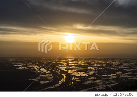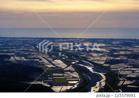 日本海に沈む夕陽と手取川扇状地