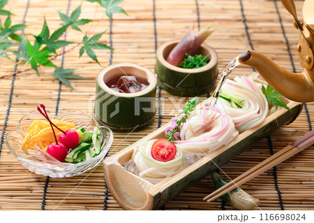 天然の竹の器に盛り付けた冷や麦