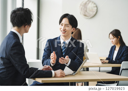 フリースペースのテーブルで商談をする爽やかな若手営業マン