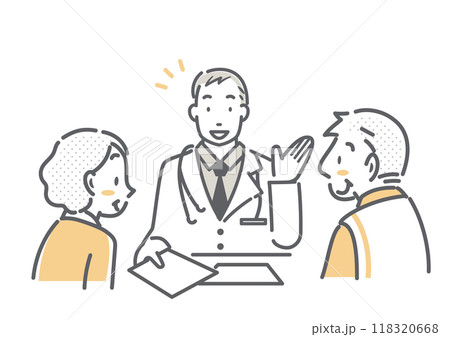医師のアドバイスを受けるシニア夫婦 シンプルでお洒落な線画イラスト