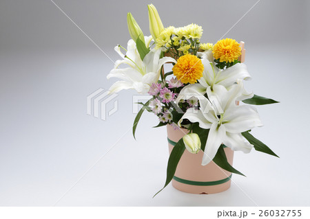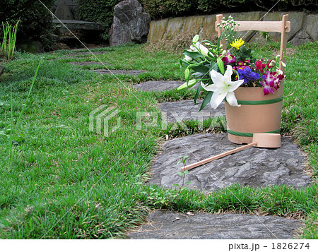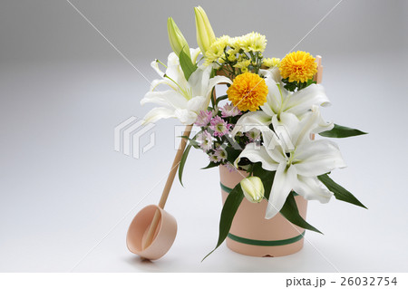 お墓参りの花 仏花 手桶 お盆 お彼岸イメージ