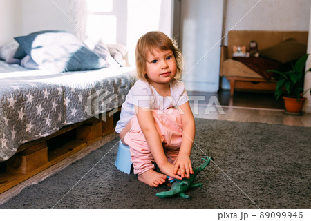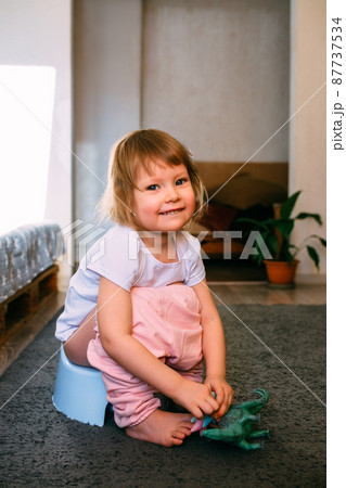 Cute toddler girl, potty training, playing with his toys on potty