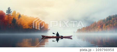 a man kayaking in an autumn colored lake
