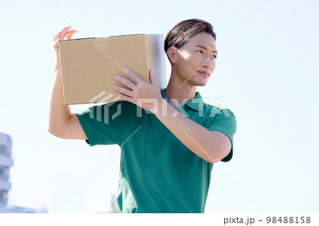 青空のもと荷物を運ぶ配達員 運送 物流 ビジネスイメージ