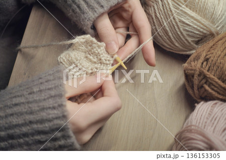 輪針で毛糸を編んでいる手元の写真 編み物 毛糸玉 メリヤス編み 趣味