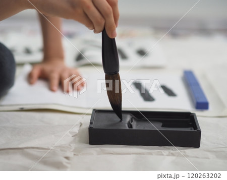 書き初め(大筆で漢字を書く子供の手)
