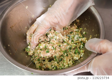 餃子の餡を混ぜる手元
