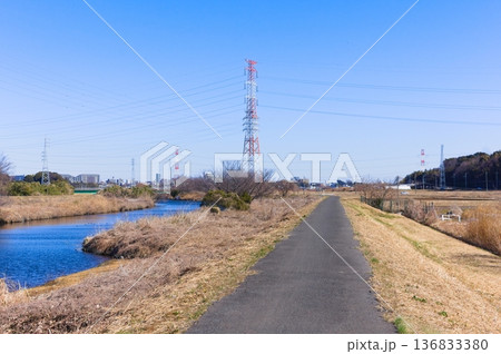 千葉県 手賀沼沿いに架かる架空送電線と鉄塔の風景
