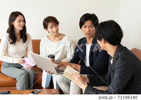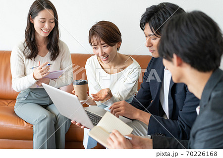 ビジネス オフィスのソファに座ってミーティングする若い男女4人