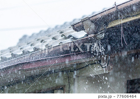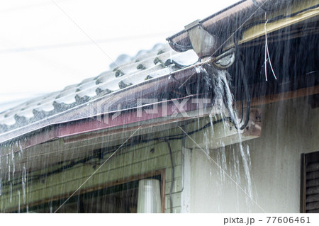 古い民家の瓦屋根に打ち付ける雨 目詰まりしている雨樋