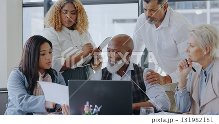 Business women, strategy and team planning in office, discussion or brainstorming insurance policy with paper. Laptop, meeting or conversation with manager for report, risk management or explain idea