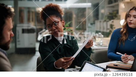 Business people, paperwork and meeting in office for finance, budget information or planning at night. Admin staff, document and overtime in agency with profit projection, discussion or review offer