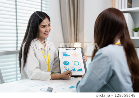 Team of financial advisory services. Asian advisor showing plan of investment to clients in the consultancy office.
