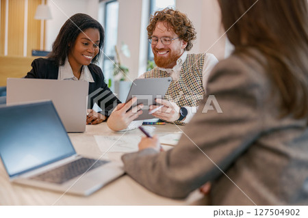 Business Interaction. Young professionals engaged in a project discussion at the office.