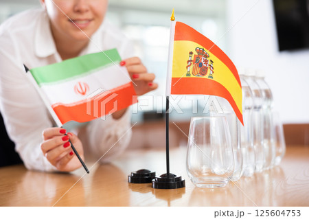 Unrecognizable girl sets midget flags of Spain and Iran before international negotiations
