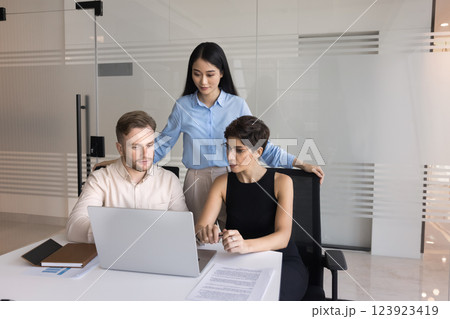 Group of young colleagues working together on a project, discussing ideas, and using laptops in a well-lit, modern office space.