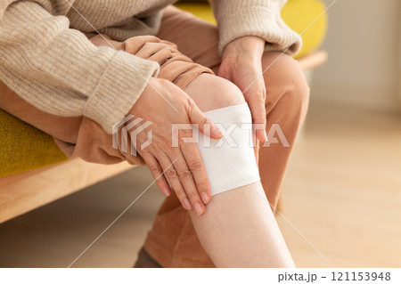 膝に湿布を貼る男性 膝痛 捻挫 関節痛 ボディパーツ