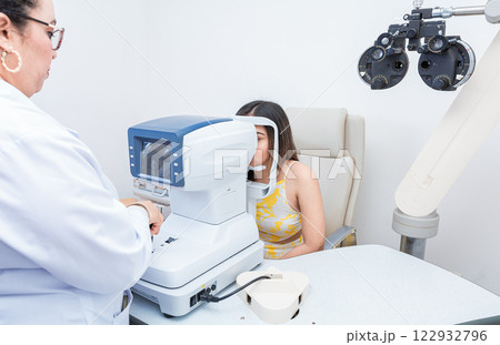 Specialist performing eye exam to female patient. Optometrist checking the eyesight of a patient with an autorefractor
