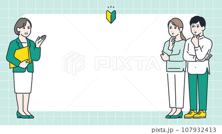 女性プランナーから説明を受ける若い夫婦のシンプルな全身イラスト素材