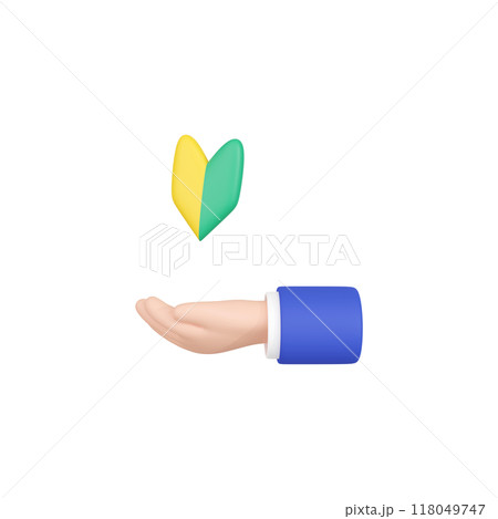 3DCG|初心者マークに寄りかかるノートパソコンを持った若い会社員の男性