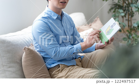 冷蔵庫を開けたまま「お金持ちになる話」の本を見る男性