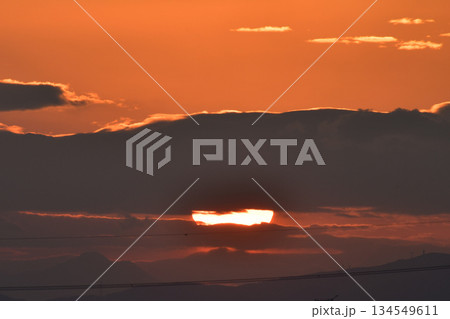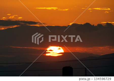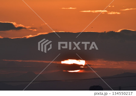 日本の横浜都市景観日本経済の憂鬱…雲間に沈む夕日や鳥。オレンジ色の空…明日はどんなものになるのか…